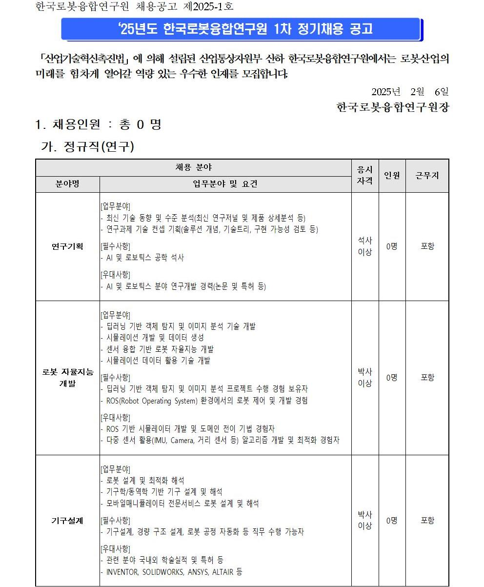[한국로봇융합연구원] '25년 1차 정기채용 공고