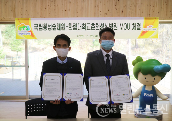 23일 홍성현 국립횡성숲체원장과 이재준 한림대학교 춘천 성심병원장이 숲의 치유기능을 활용한 의료진단 연계 시스템 협력에 관한 업무협약을 맺었다.©열린뉴스통신