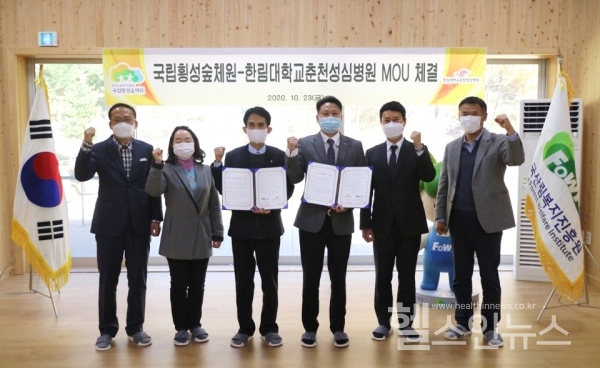 한림대춘천성심병원 제공, 이재준 한림대춘천성심병원장(왼쪽 네 번째)과 홍성현 국립횡성숲체원장(왼쪽 세 번째)이 23일 국립횡성숲체원에서 숲체험치료에 관한 업무협약을 체결했다